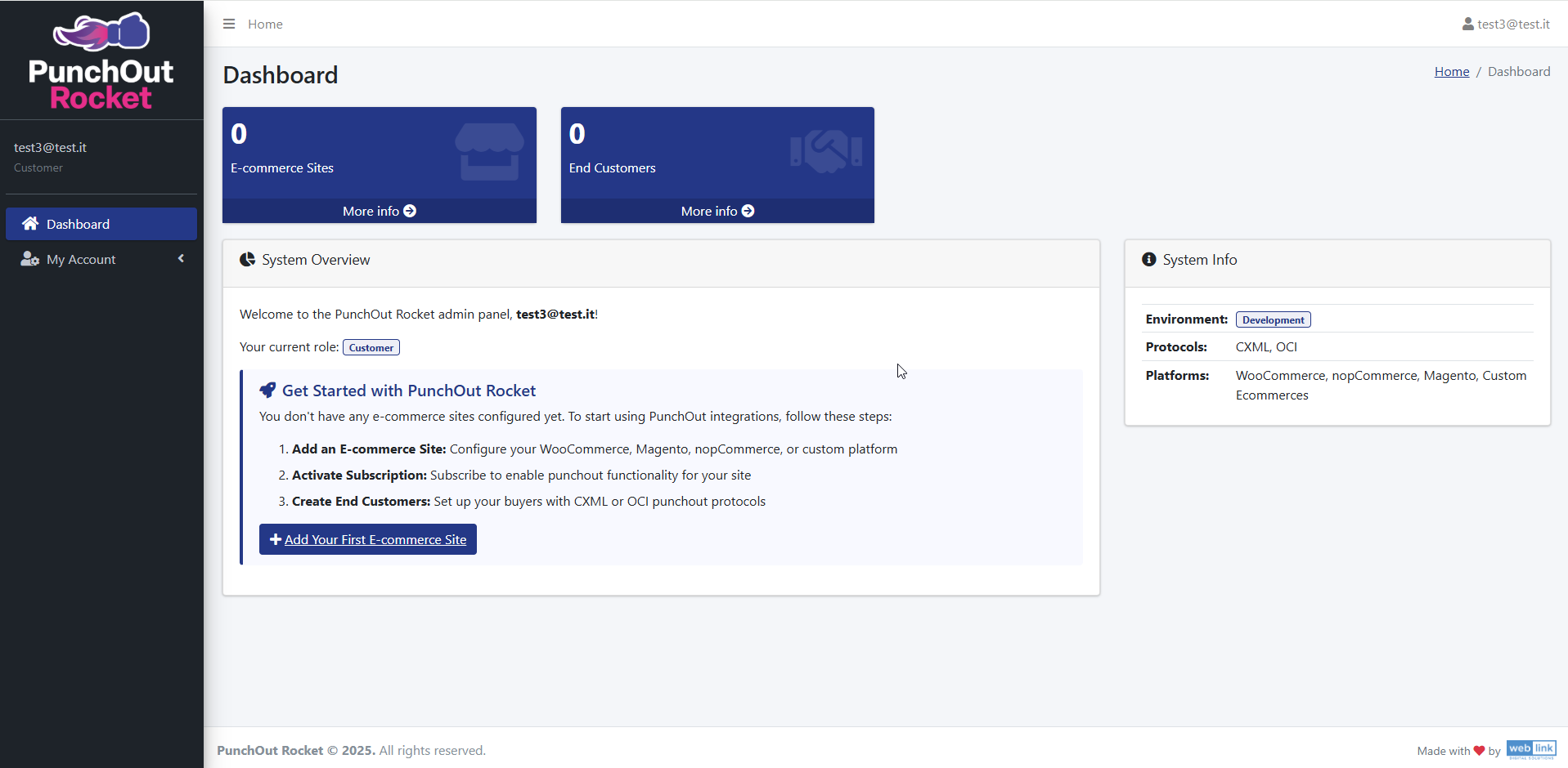 How it Works: Create a dedicated user account in your e-commerce store (e.g., a specific user role in WooCommerce). This user must have the correct permissions to see the product catalog and pricing that this specific End Customer should have access to. Enter the email address or username of that user here. During a PunchOut session for this End Customer, PunchOut Rocket will clone this user’s session, ensuring they shop with the correct entitlements. - Protocol: Choose the protocol their system uses: cXML or OCI.