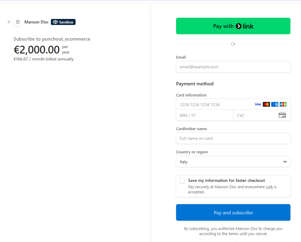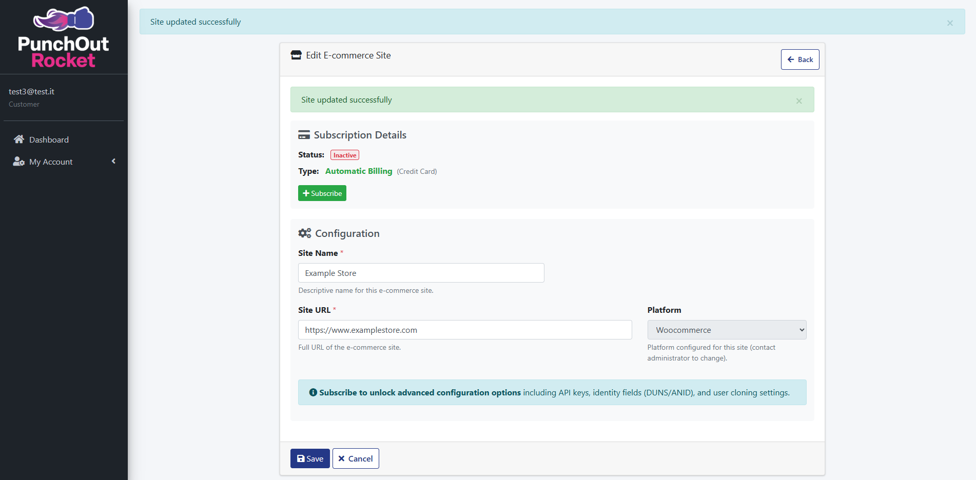 After saving, your site is created but the service is not yet active. You must activate a subscription to unlock the PunchOut functionality.