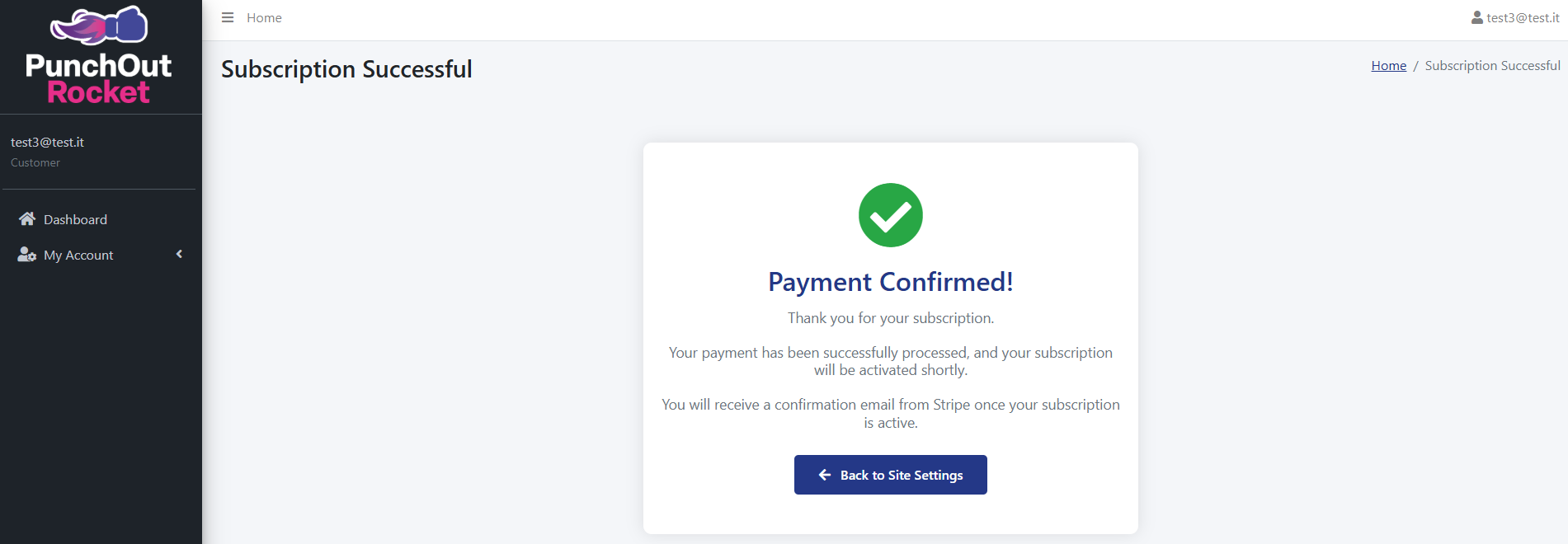- After a successful payment, you will see a “Payment Confirmed!” message. Click the “Back to Site Settings” button to return to the PunchOut Rocket platform.